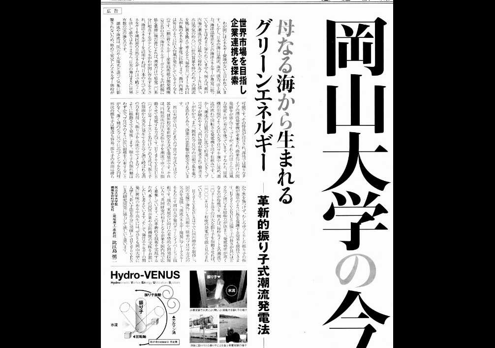 "Pendulum power: Innovative pendulum-dynamo for converting tidal energy into electrical power" Okayama University e-Bulletin Vol.7 (2014年6月) |