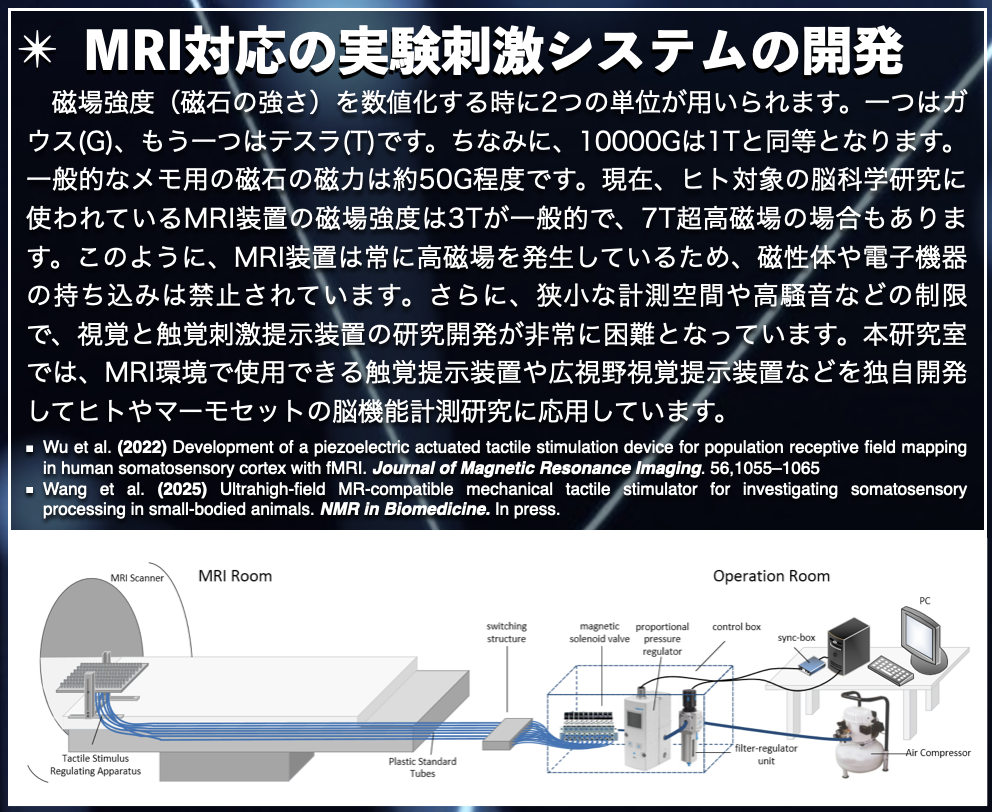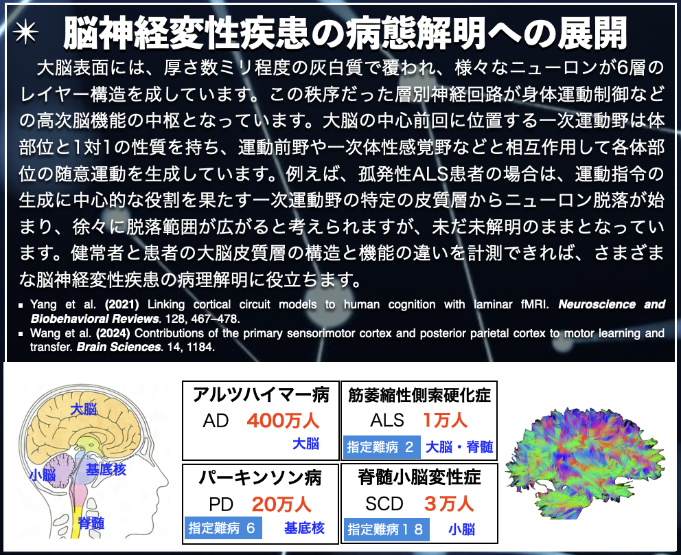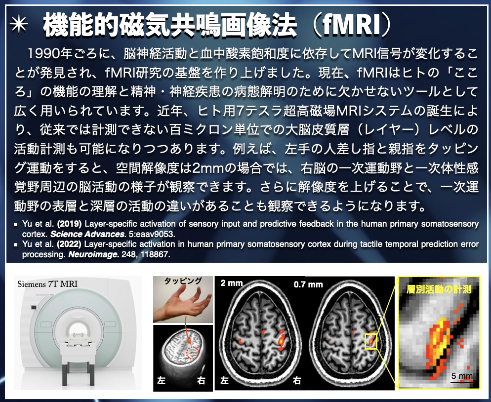 ヒトの脳は、約1000億個もの膨大な数の神経細胞が多段階の階層構造をもつ複雑な生体情報処理システムとなっています。脳では、機能素子である神経細胞がそれぞれの階層において神経回路を形成し、高度な情報処理を行うことにより、多様な脳機能を実現しています。その神経回路の破綻はパーキンソン病などの脳神経変性疾患を引き起こし、日常生活に支障をきたしています。当研究室では、最先端の7テスラ超高磁場・機能的磁気共鳴画像法(fMRI)を機軸として、ヒトの大脳皮質層間の神経回路機能を検討し、大脳皮質層から全脳にわたる多階層な脳機能の解明を試みています。また、脳波(EEG)の高時間分解能の特徴を活かして時間軸において脳機能を検討し、リッチな時間・空間情報を含む多次元脳イメージングデータの統合解析を実現し、ヒト脳の脳機能の全容解明を目指しています。さらに、様々な精神活動とその異常を各階層の脳機能に結びつけて理解し、脳精神変性疾患の病因解明および早期診断・治療・予防法の開発へ展開して行きます。