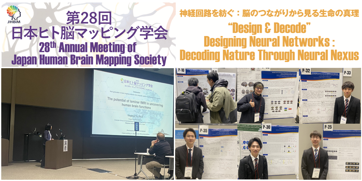 Prof. Yu delivered a presentation on the future perspectives of laminar fMRI techniques. In addition, Researcher Chenyu Wang, PhD student Xiangfu Yang, Master’s students Kenta Ueno, Yuto Aketani, Yodai Ueda, and Takuma Yamamoto presented their works at the 28th Annual Meeting of the Japan Human Brain Mapping Society (JHBM2026) which was held from Mar 20 & 21, 2026 in Himeji, Japan.