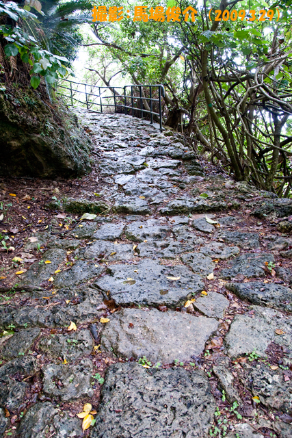先島諸島の火番盛群/やや先細りの方型の石積台階段は、L字型についている