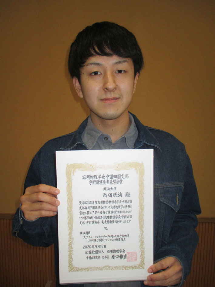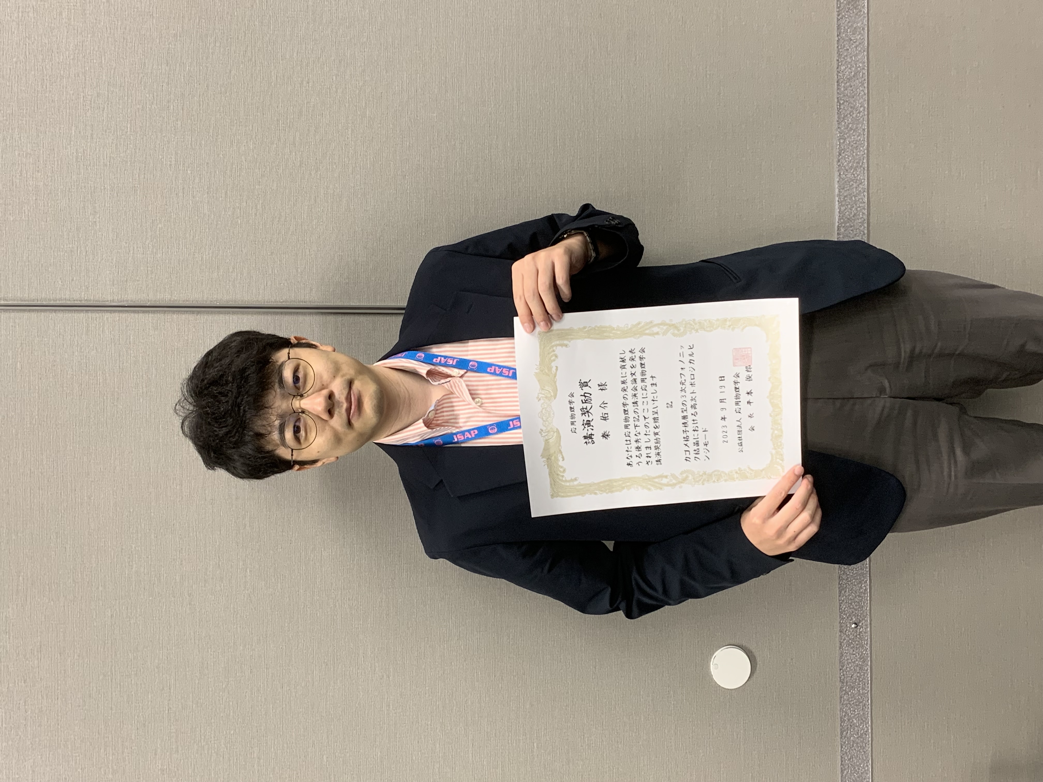 2020.11/10: 高杉君と町田君が、2020年度応用物理・物理系学会中国四国支部合同学術講演会にて最新の研究成果を発表し、第25回応用物理学会中四国支部発表奨励賞を受賞しました.
